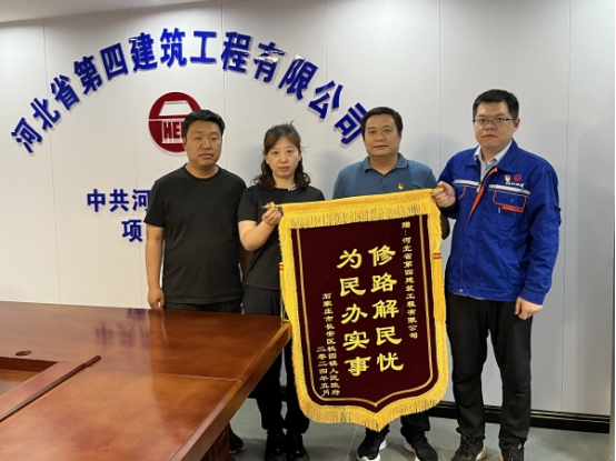“感谢河北四建对镇政府工作的大力支持,解决了桃园镇学府联合社区前进村与滹沱河河堤路之间的道路损坏严重的大问题……”6月5日下午,石家庄市长安区桃园镇人民政府代表琚红珊带着浓浓的谢意专程来到九分公司中共河北省委党校项目部,将“为民办实事 修路解民忧”的锦旗交到分公司党总支书记、经理刘喜良手里,对河北四建公司的大力支持和帮助表示诚挚感谢。