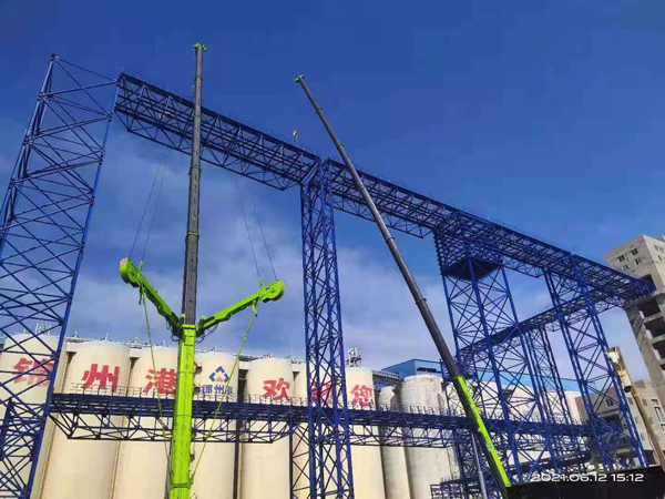 该项目位于辽宁省锦州市锦州港内,钢结构桁架较多,有钢结构栈桥15道,每道栈桥由支架、桁架、输送桥面组成,栈桥平面总长度约2100米,桁架高度自5米到72米不等。此次大型吊装是11#栈桥桁架的吊装,是高难度吊装作业之一。该栈桥不在同一标高的点有14个,横纵方向轴线多达56条,位于转接塔和仓边塔之间,场地狭小,需要从46.5米分四榀桁架到达58米,每一榀桁架重量为30吨左右,宽8米,长度从28米到32米不等。项目部综合安全、质量、成本等多种因素,采用500吨加超起装置汽车吊主吊和300吨汽车吊辅吊进行作业。