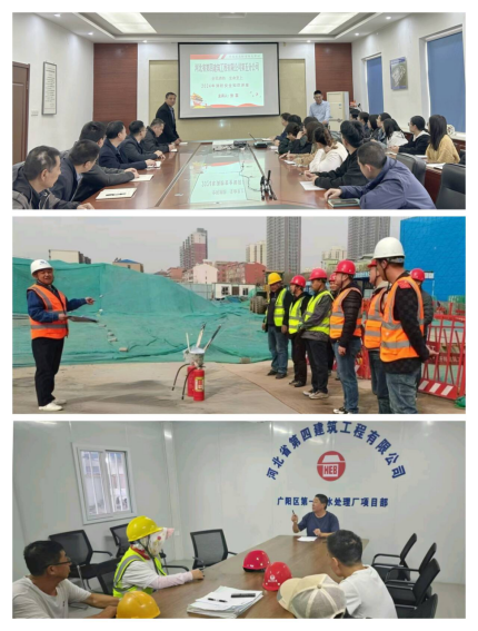 排查隐患,防患于未然。五分公司组织机关与项目部进行了全面深入的火灾隐患大排查。机关重点针对办公室、电动车棚、食堂和职工宿舍等区域展开细致排查,并及时整改发现的隐患。11月12日,广阳项目部组织全体施工人员开展学习与消防演练活动,特别针对塔司、电梯司机、信号工等特殊工种作业人员进行了有针对性的培训,结合施工现场实际情况详细解读消防法规的核心要点,深入剖析因电气故障、明火使用不当等引发火灾的典型案例,着重强调塔吊、施工升降机等设备运行区域及操作室的防火要点以及消防器材的正确配备、使用和日常维护方法。此外,因当地环保政策停工的藁城小学、定兴粮库项目,安排专人值守,定期加强对消防设施的日常检查,并详细记录各类消防设施的状态信息,如灭火器压力是否正常等,确保停工期间消防设施的完好有效,将火灾隐患扼杀在萌芽状态。(五分公司)